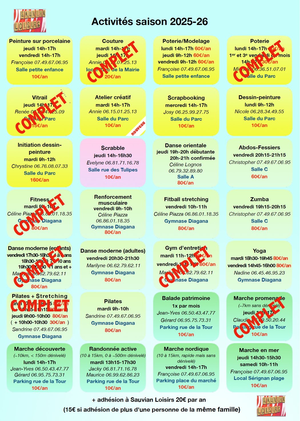 IMPORTANT : comme indiqué en bas de l'affiche, les prix indiqués par activités sont ANNUELS auxquels s'ajoute le montant de l'adhésion à l’association, 20 € en cas d'adhésion individuelle, ou 15 € par personne en cas d’adhésion de plus d’une personne de la même famille.